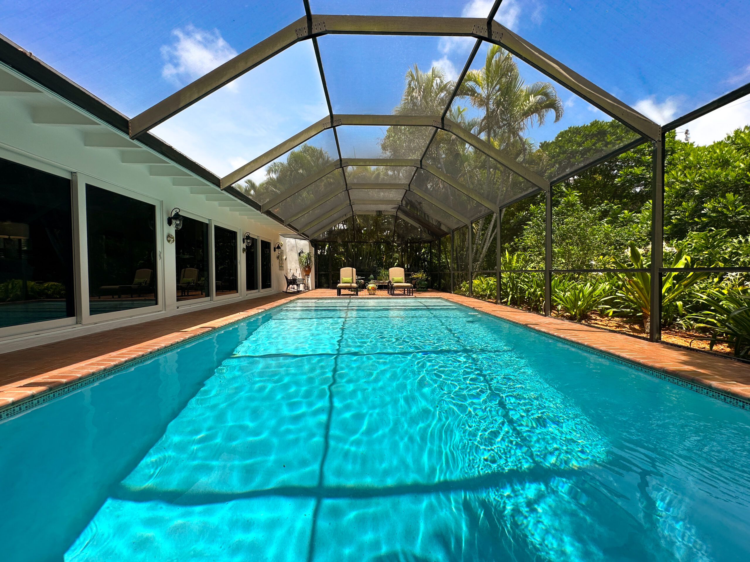 Step outside into your private backyard oasis, where a resurfaced, fully screen-enclosed pool awaits—ideal for weekend lounging, alfresco dining, and hosting under the stars. Beyond the pool patio, surrounding you is a breathtakingly lush garden bursting with exotic plants and vibrant flowers, including Japanese and Australian ferns, orchids, Jasmine, and even a thriving avocado tree—a botanical masterpiece.